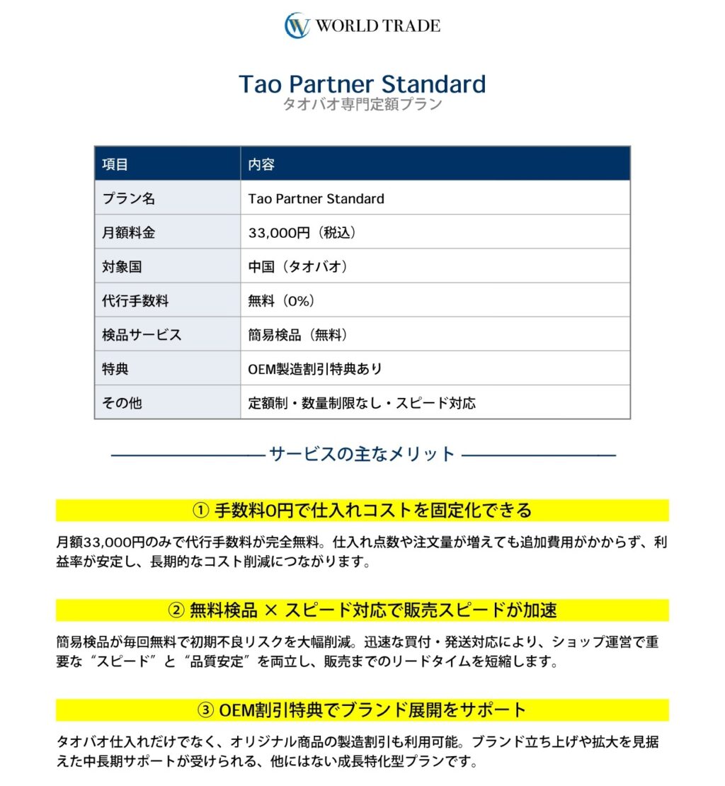 WORLD TRADEが提供するタオバオ専門の定額代行プランです。